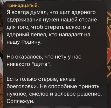 Как и положено российскому царю — ты не разбираешься в ситуации, а теперь ты начинаешь сморщиваться, и твои боеголовочки начинают сморщиваться вместе с тобой — и это потому, что на боку твоих ракет написано — СДЕЛАНО В КОСТРОМЕ, а на боку моих танков нарисованы железные кресты — и ловить тебе здесь нечего вместе с твоими боеголовками. А теперь — сваливай отсюда со своей мамочкой!