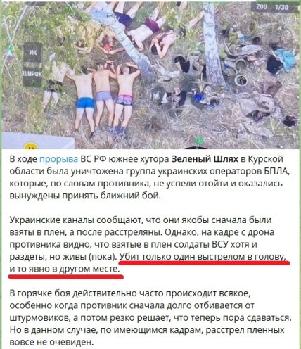 Российские версии разметаются в пух и прах, а на поверхности очередное преступление и попытка запугать, а также спровоцировать. Они не только пытаются запугать украинских военных психологическим нарративом "в плен не берем!", но и пытаются спровоцировать ответные действия. Ждут, когда мы тоже начнем мстить за наших ребят расстрелами их героических сифилитиков, чтобы потом собрать Совбез ООН и обвинить нас в военных преступлениях.
