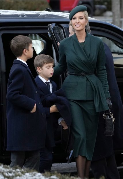 Элегантно и уместно выглядела Иванка Трамп. Приглушенный зеленый цвет наряда позволял и выделяться на фоне других почетных гостей, и не привлекать внимания больше, чем допустимо. И именно так могла выглядеть шляпка на Мелании, если бы у широких полей не было особой задачи. Кроме сокрытия глаз и эмоций, не дать никому возможности приблизиться для поцелуя. Кажется, все-таки поцеловать Меланию удалось лишь Дональду Трампу и не с первой попытки.