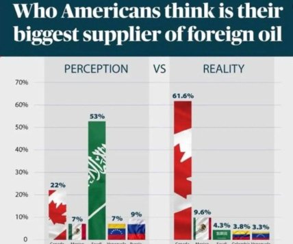 То, что 53% американцев считают Саудовскую Аравию главным поставщиком, свидетельствует о силе медийного бренда "Саудовская нефть". В то же время, реальный импорт из Саудовской Аравии — всего 4,3%, то есть в 10 раз меньше, чем из Канады. Это показывает, что восприятие не имеет ничего общего с реальностью, но имеет политический вес (например, обсуждения нефтяных соглашений с Саудовской Аравией всегда резонансны).