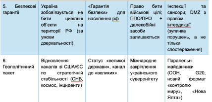 • Интегрированная украинская ПВО/ПРО + дальнобойные средства остаются; Украина обязуется не бить по гражданским объектам вглубь РФ при соблюдении соглашения РФ (удары по военным целям — по отдельным правилам деэскалации).
