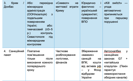 Стимул для РФ: дорожная карта более ощутимой экономической нормализации после завершения Этапа 2 (но сохранение контроля импорта оружия). При любой попытке саботажа санкционный автоснапбек и автоперевод части замороженных активов РФ в Фонд восстановления Украины.