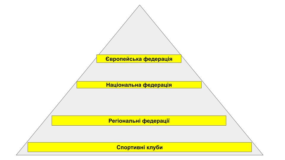 На верхушке иерархии пирамидальной структуры находится европейская федерация, организованная по принципу национальной федерации. В состав европейской федерации по каждому виду спорта входят по одной национальной федерации от страны.