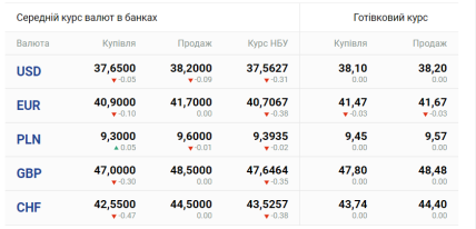 По данным портала "Минфин", в четверг, 1 февраля, средний курс доллара в украинских банках составляет 37,65 грн (покупка) и 38,20 (продажа). Наличный курс — 38,10 (покупка) и 38,20 (продажа). В то же время, официальный курс Национального банка Украины составляет 37,56 грн.