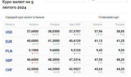 По данным портала "Минфин", в пятницу, 9 февраля, средний курс доллара в украинских банках составляет 37,60 грн (покупка) и 38,0 (продажа). Наличный курс — 37,96 (покупка) и 38,05 (продажа). В то же время, официальный курс Национального банка Украины составляет 37,57 грн.