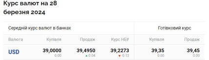 По данным портала Минфин, в четверг, 28 марта, средний курс доллара в украинских банках составляет 39,0 грн (покупка) и 39,49 (продажа). Наличный курс — 39,35 (покупка) и 39,45 (продажа). В то же время официальный курс Национального банка Украины — 39,22 гривны.