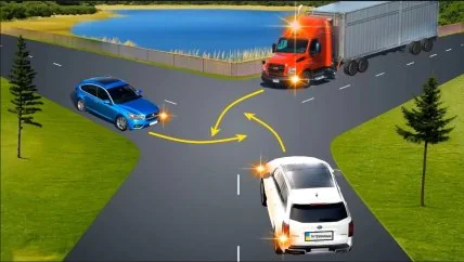 Представьте себе типичную городскую улицу в час пик. К перекрестку подъезжают одновременно синий авто, белый грузовик и белая легковушка. Все они включили левые поворотники, планируя совершить левый поворот. Перекресток абсолютно пуст, поблизости нет ни светофора, ни дорожных знаков.