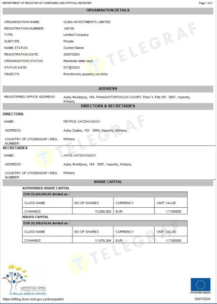 - Компания — OLBIA INVESTMENTS LIMITED, в собственности — 2,8% отеля. Это также оффшор, на этот раз – кипрский. Информацию о нем "Телеграфу" удалось получить в распоряжение (об этом ниже).