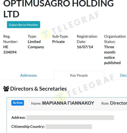 Она также руководила (или руководит до сих пор) рядом других компаний из орбиты Боголюбова-Коломойского. Например, Гианнаку была распорядителем акций ПАО "Харьковский жировой комбинат" (с орбиты Коломойского), директором OPTIMUSAGRO HOLDING LTD (запорожский маслозавод, также в кругу интересов Коломойского) и Sunaltezza Consulting Ltd (это уже активы Боголюбова) и т.д.