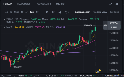 Такая информация появилась на сайте крупнейшей криптовалютной биржи по объему торговли Binance. Там указали, что по состоянию на 10 ноября текущего года, цена биткоина превысила отметку в 80 тысяч долларов.