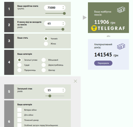 Даже при минимальном стаже в 15 лет можно оформить пенсию, сумма которой будет около 12 тысяч гривен. Это было вычислено "Телеграфом" с помощью пенсионного калькулятора.