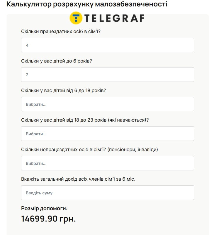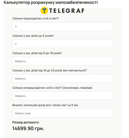 А какой ожидается помощь для семьи, где четверо трудоспособных взрослых и двое детей, которые ходят в школу, разбирался "Телеграф". В этом помог специальный калькулятор на сайте "Пятачок".