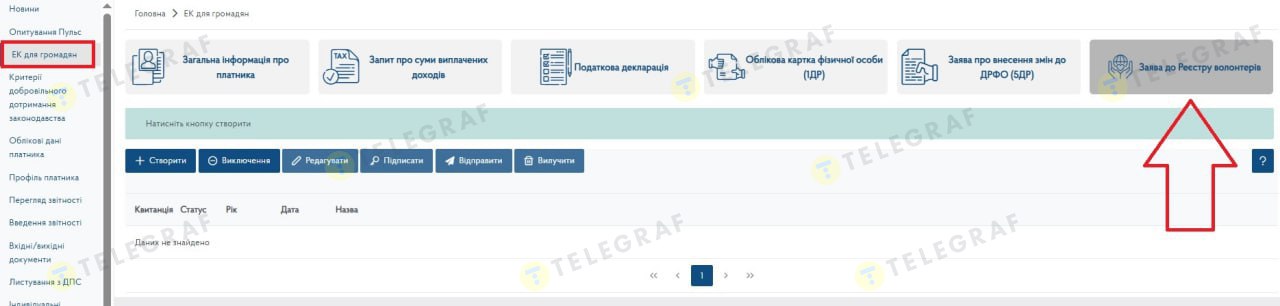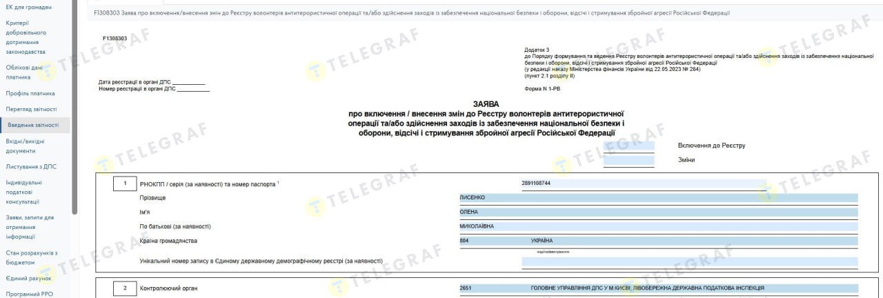 Находясь там, сначала жмете на "Заявление в Реестр волонтеров", а затем кнопку "Создать". Именно тогда Налоговая загрузит вам бланк заявления F1308303, которое в основном будет заполнено автоматически. ГНС впишет базовые данные о человеке, потому что знает их по регистрации — ФИО, местожительство, налоговый код, телефон.
