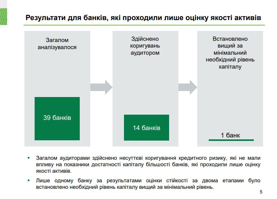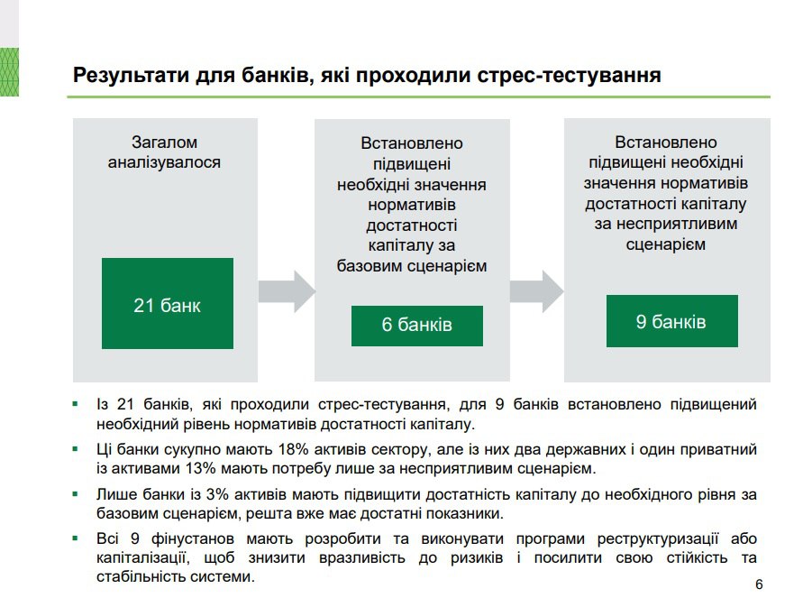 По итогам Национальный банк сообщил, что только для одного банка было установлено повышенное требование по капиталу. Еще в случае с 9 банками, в отношении которых проходило стресс-тестирование, НБУ установил повышенное требование относительно достаточности капитала по неблагоприятному (наихудшему) сценарию и 6 банков — повышенное требование по благоприятному сценарию. То есть, эти структуры не прошли все испытания регулятора без вопросов и нареканий.