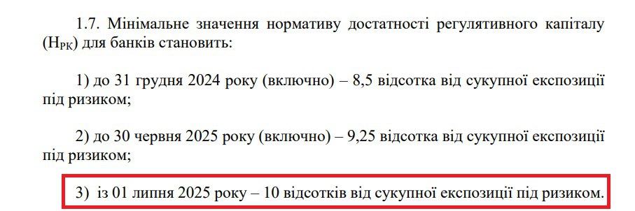Но что никто не засекречивал и что есть в официальной отчетности, это текущие значения норматива достаточности капитала каждого банка, к которому привязывалась оценка регулятора: он показывает, достаточно ли у банка собственных денег (капитала) для покрытия возможных проблем по погашению выданных кредитов. По постановлению НБУ №65 от 7 июня 2024 года текущее требование Нацбанка — это 10%, то есть банки должны делать все возможное, что этот норматив не спускался ниже 10%. Больше можно (приветствуется самая большая цифра), меньше нельзя.