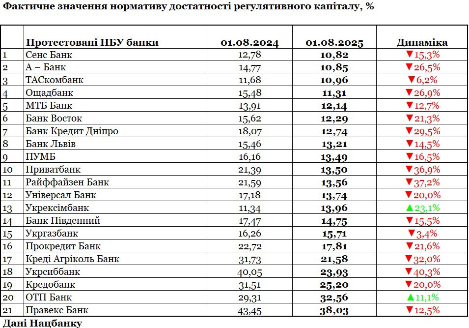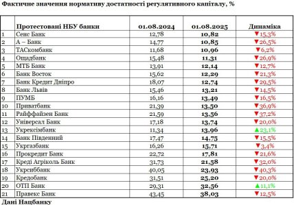 По данным Нацбанка, на 1 августа 2025 года норматив достаточности капитала в Украине нарушал только один банк – РВС Банк. Вместо минимальных 10% у него всего 7,15%. Еще несколько банков имеют немного больше 10% показатели, то есть находятся недалеко от нарушения: Сэнс Банк (10,82%), А – Банк (10,85%), ТАСкомбанк (10,96%). А два банка из протестированных имеют большие превышения – Правэкс Банк (38,03%) и ОТП Банк (32,56%).