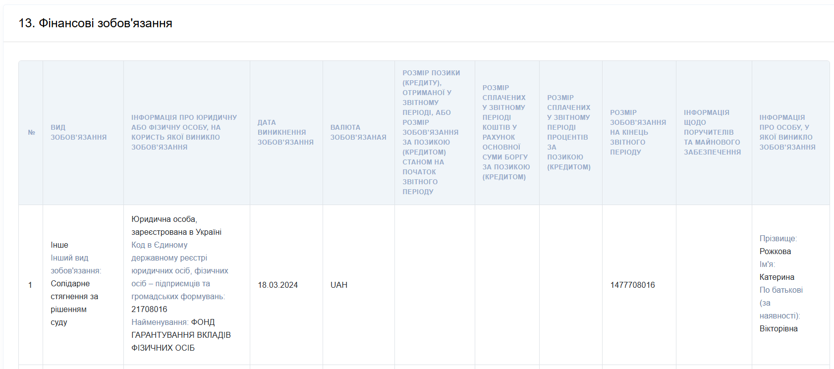 В декларации Екатерины Рожковой указано, что на 18 марта 2024 года сумма солидарного обязательства по этому взысканию составляет 1,48 млрд грн.