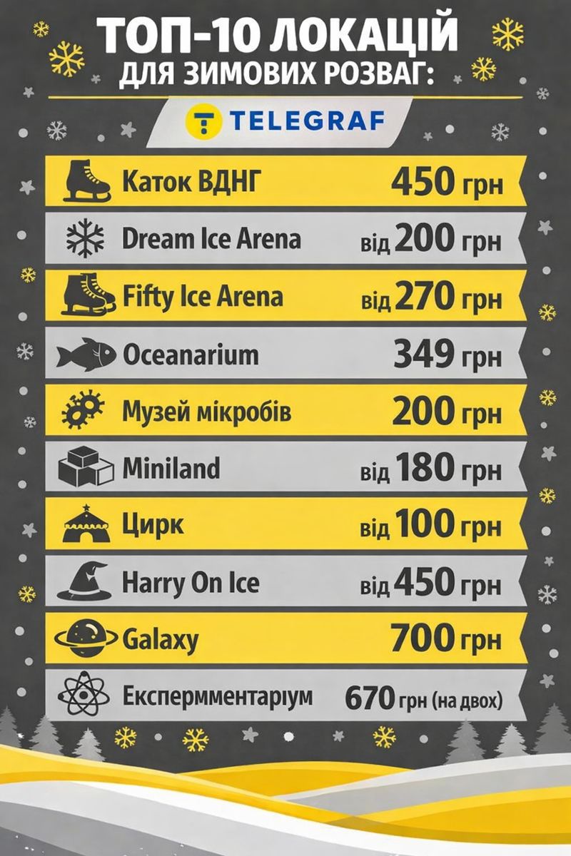 Зимние каникулы 2026 года предлагают киевлянам и гостям города настоящее разнообразие развлечений: от самого большого катка в Украине площадью более 3000 квадратных метров до интерактивных музеев, где можно увидеть живые микроорганизмы через микроскоп или узнать историю туалета. Цены стартуют от 150 гривен за вход в музеи, а некоторые парки вообще открыты бесплатно.