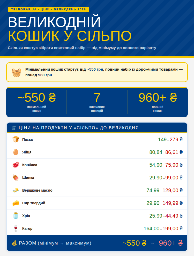 Как подсчитал "Телеграф", минимальный вариант праздничного набора в "Сильпо" стоит примерно от 550 гривен. В него входят основные продукты, без которых обычно не обходится ни одна пасхальная корзина.