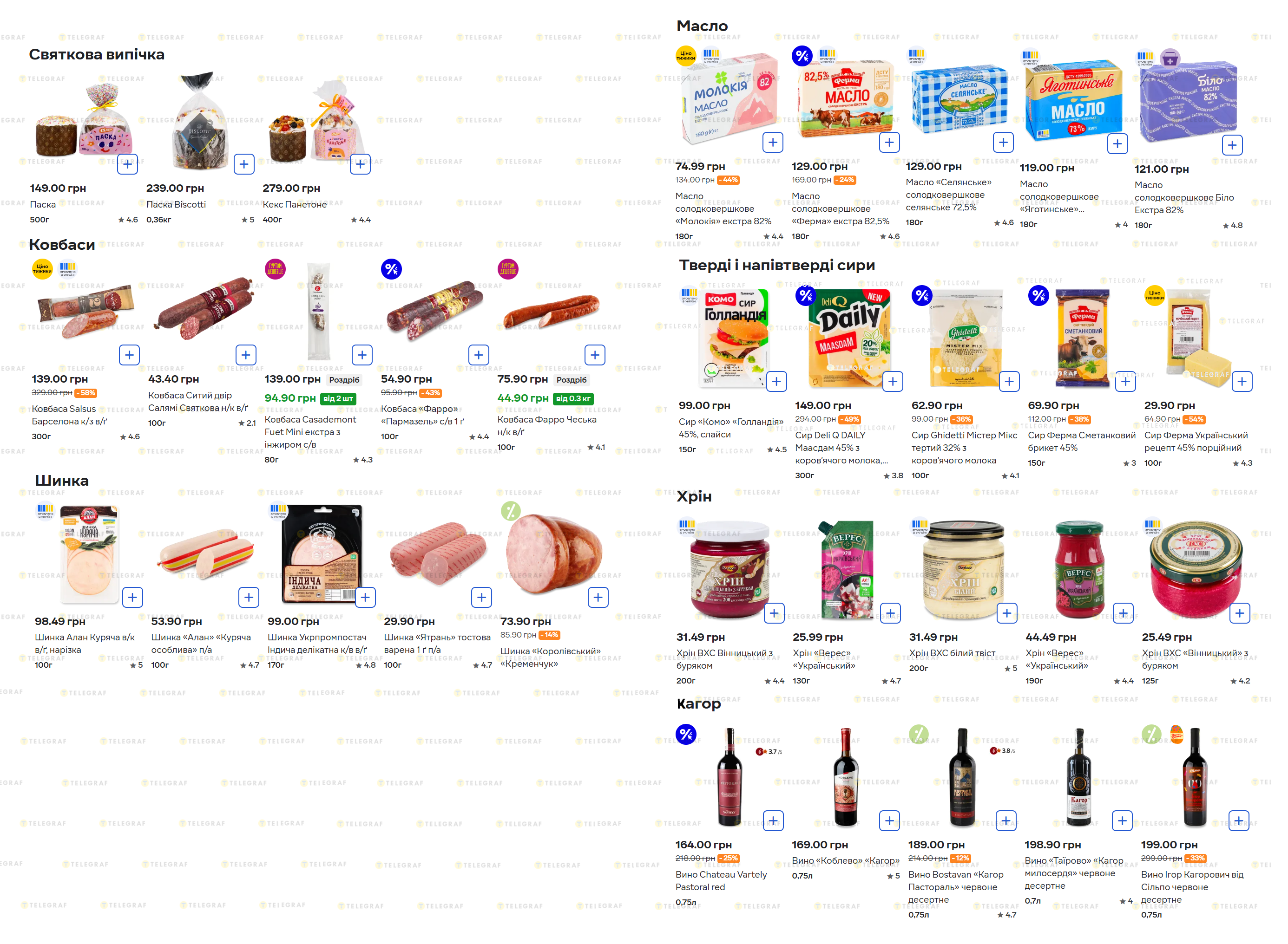 Сливочное масло стоит от 74,99 до 129 гривен за пачку. Твердый и полутвердый сыр можно приобрести по ценам от 29,90 (100 г) до 149,99 гривны (упаковка в 300 грамм). Хрен остается относительно доступным – от 25,99 до 44,49 гривны за банку.