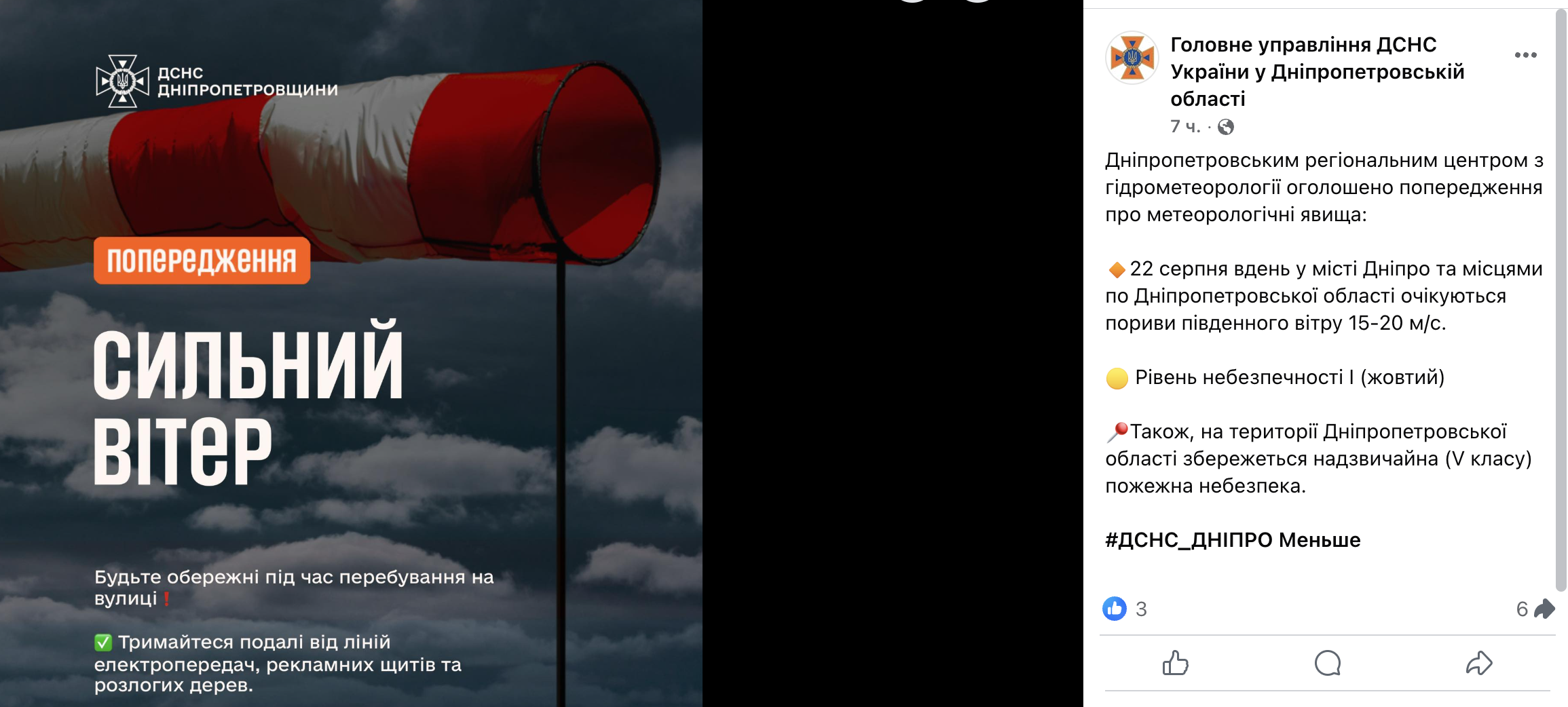 Добавим, что утром 22 августа в ГСЧС предупреждали об опасных метеорологических явлениях, а именно о порывах южного ветра 15-20 м/с — уровне опасности I (желтый). К тому же, на территории Днепропетровской области чрезвычайная (V класса) пожарная опасность.