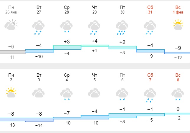 Об этом свидетельствуют прогнозы погоды.Так, по данным синоптиков сервиса meteofor, после небольшого потепления, которое прогнозируют с 28 по 30 января (до +1+4 градусов), в областной центр снова придут морозы. Синоптики предполагают, что с 31 января по 5 февраля столбики термометров в городе опустятся до уровня -8-14 градусов. В некоторые дни возможен небольшой снег.