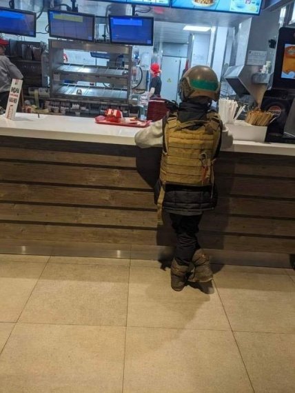 "Это фото нужно, чтобы весь мир увидел! Харьков: ребенок в бронежилете и каске ждет заказ в KFC", — говорится в сообщении.
