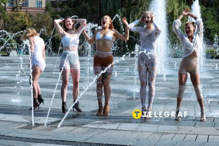 Пятеро красивых подтянутых девушек в интересной одежде и на каблуках снимали там видео для TikTok в струях воды. Получилось очень эффектно.