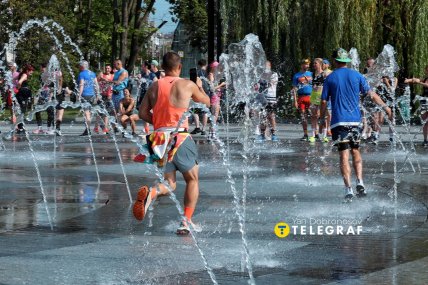 Кроме них освежиться в струях фонтана забежала большая колонна бегунов. Участники забега в спортивной одежде разных цветов двигаются по мокрой площади, погода для пробежки прекрасная — небо ясное и голубое, с живописными облачками.