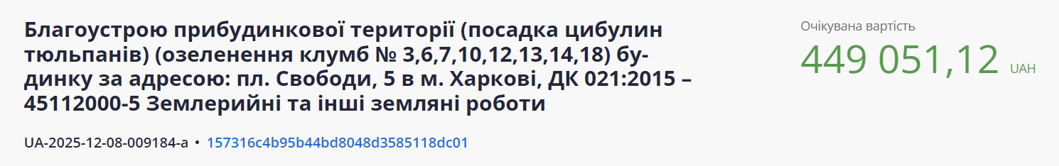 Из открытых данных известно, что расходы по закупке тюльпанов растут. С 2022 года "цветочные" платежи уже превысили 1,2 млн грн, а поставкой во всех случаях занимался один и тот же ФЛП. В ноябре 2024 года "Госпром" также заключал договор с Горбуновым на 419 156 грн для высадки 12 500 луковиц.