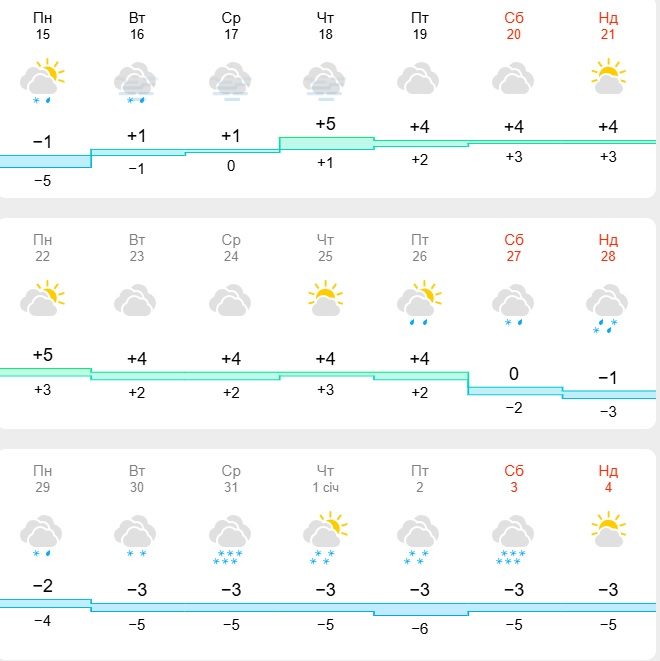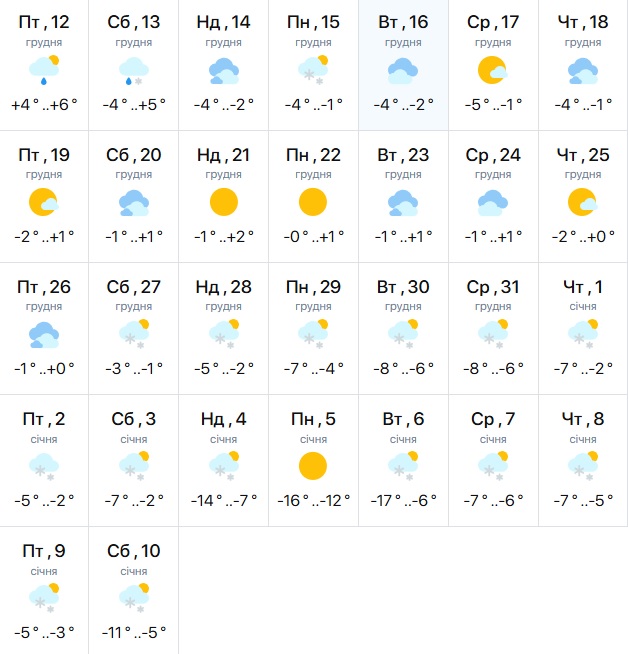 Аналогичного мнения придерживается и погодный сайт meteo.ua. Его специалисты прогнозируют в Харькове снежную погоду в период с 27 декабря по 10 января. Однако синоптики данного сервиса предполагают, что в период с 4 по 6 января областной центр могут накрыть лютые морозы — до -16 градусов.