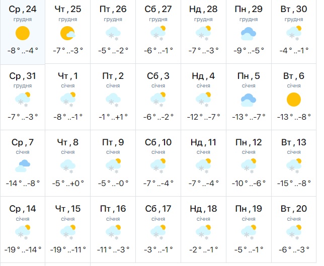 "Самыми холодными станут 25 и 26 декабря и предновогодние дни с 29 по 31 декабря. Кроме того, рассеется пасмурность, которая покрывала Украину почти весь декабрь", — сказал Кибальчич.