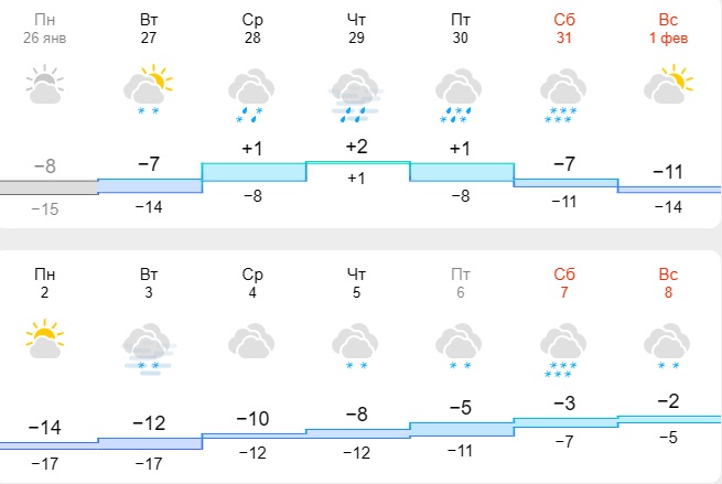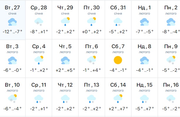 Схожего мнения придерживаются и специалисты meteo.ua. Они прогнозируют потепление с 28 января по 31 января, во время которого столбики термометров будут находится на уровне +2-5 градусов. Однако с приходом февраля ненадолго снова может похолодать (до -8 градусов). Возможны осадки в виде снега или дождя.
