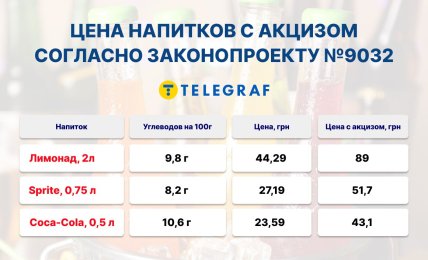 Минфин в экспертизе законопроекта № 9032 подтверждает: предложенное документом налогообложение приведет к росту цены сладких безалкогольных напитков где-то на 88% (расчет произведен на основе напитка Coca-Cola 1 л ценой 30 грн, по данным популярных сайтов).