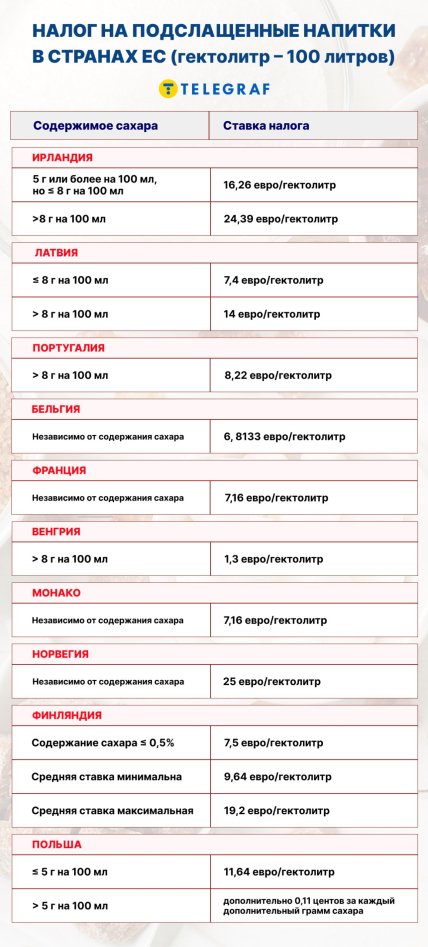 Им предлагалось "путем внесения изменений в Налоговый кодекс отнести воды, включая минеральные и газированные, с добавлением сахара или других подсластительных или ароматических веществ, в подакцизные товары и установить специфическую ставку налога в размере 0,1 евро за 1 литр напитка". Уф-ф, облегченно выдохнули производители соков, прекрасно зная, что содержание сахара в соках выше, чем в подслащенной воде.