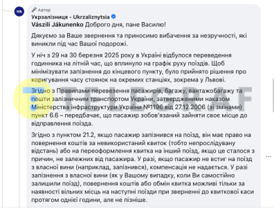 Там также напомнили правила перевозки пассажиров: "Согласно пункту 6.6, пассажир обязан занять свое место до отправления поезда. Если пассажир опоздал на поезд по собственной вине, компенсация не предусмотрена".