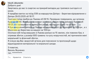 Из-за этой ситуации он вынужден был добираться до места назначения самостоятельно, потратив 600 гривен на поездку маршрутками и такси. "Я получил не только финансовый ущерб, но и кучу неудобств", — отметил он, требуя от "Укрзализныци" компенсации.