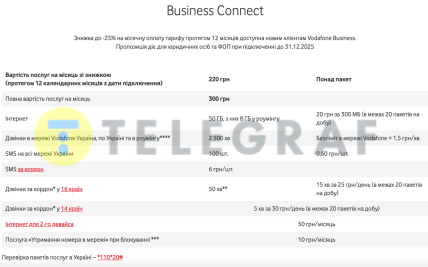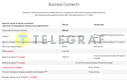 Ранее "Телеграф" писал о том, что с 27 марта 2025 мобильный оператор Киевстар внедрил новый тарифный план для корпоративных клиентов — "Бизнес UA. Онлайн". Его особенностью является возможность подключения только через официальный сайт оператора, а фиксированная цена составит 230 грн/мес, по меньшей мере, до 31 декабря 2025 года.