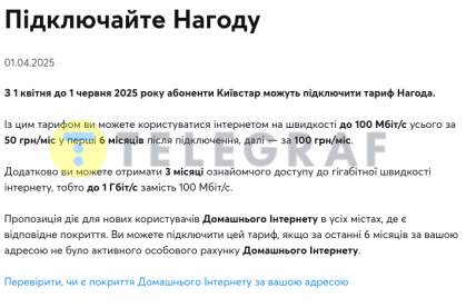 Согласно официальной информации, тариф доступен только для новых абонентов, то есть тех, кто не пользовался услугой домашнего интернета от Киевстара за последние полгода по своему адресу.