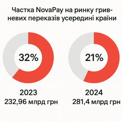 ‚В 2024 году, по данным НБУ, объем внутригосударственных переводов через платежные системы в Украине составил 1,34 трлн грн (эквивалентно $33,2 млрд), что на 83% больше, чем в 2023 году. Доля NovaPay в 2024 году составила 281,4 млрд. грн.