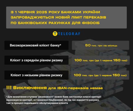 Начиная с 1 июня платежные лимиты на переводы банков в Украине будут уменьшены до 50—100 тыс. грн: клиентам высокого риска оставят 50 тыс. грн, а вот для лиц со средним и низким уровнем риска планку опустят со 150 до 100 тыс. грн. Это правило заработает автоматически.