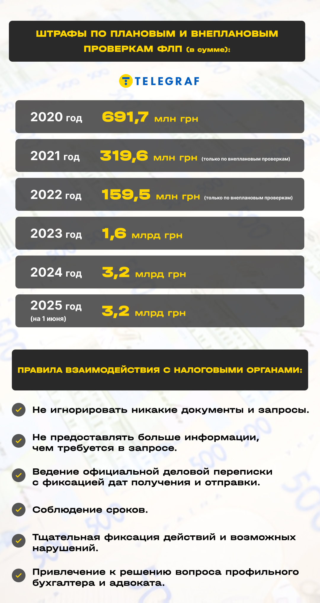 "По результатам проверок часто доначисляют НДФЛ (налог на доходы физлиц), военный сбор, ЕСВ (единый соцвзнос) и штрафы за неподачу единовременных деклараций. В 2025 году мы также наблюдаем усиление подходов со стороны ГНС к проверкам операций, имеющих признаки трансграничных — переводы из-за границы, криптовалюта, работа через платформы типа Upwork и т.д. В этих ситуациях особенно важно иметь задокументированные источники дохода и объяснение экономической сути операций", — отметил Сивоздрав.