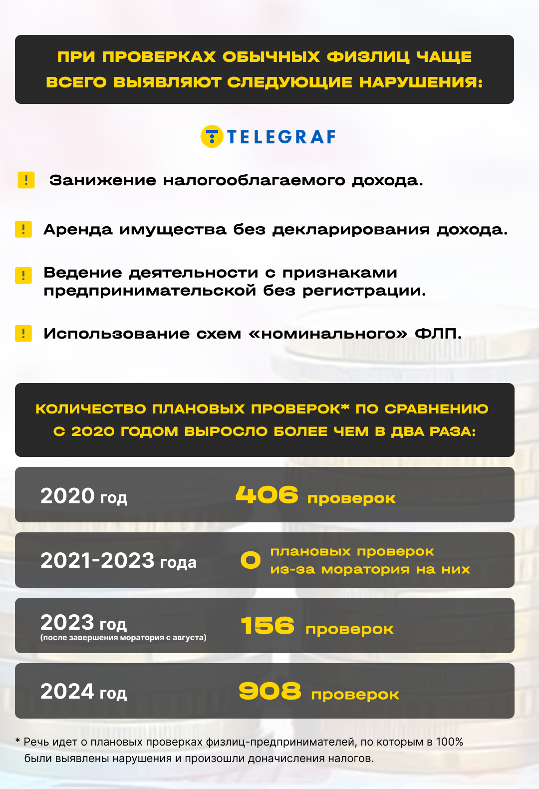 - 2023 год (после завершения моратория с августа) — 156 проверок — 156 доначислений;