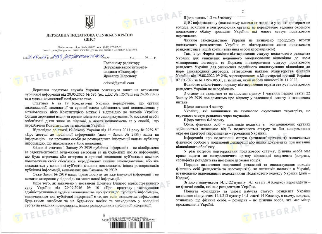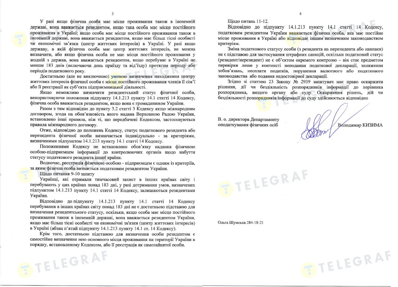 "Информация о налоговом статусе (резидент/нерезидент) указывается физическим лицом в налоговой декларации или других документах при наступлении соответствующей обязанности. В случае необходимости подтверждения налогового статуса физическое лицо имеет право предоставить органу контроля соответствующие документы. В частности, сертификат резидентства другого государства и т.д.", — пояснил Кизима.