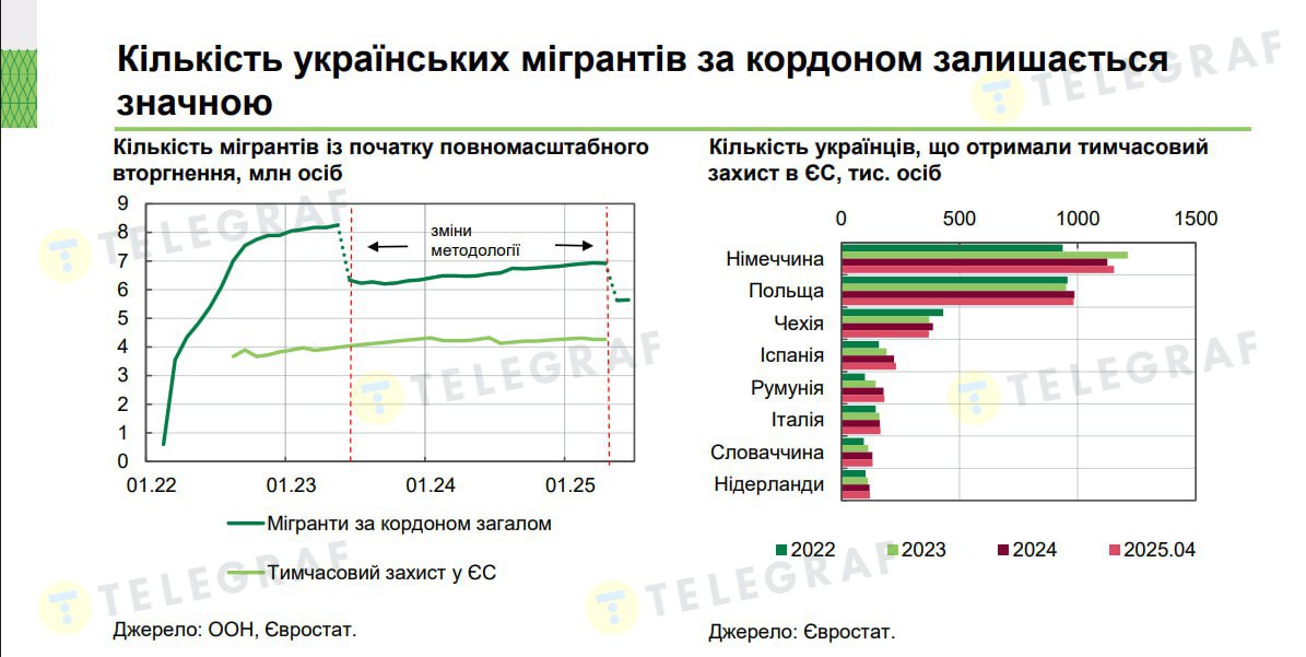 В последнем макроэкономическом отчете Нацбанк со ссылкой на данные ООН уменьшил численность находящихся за рубежом украинцев (преимущественно из-за войны) на 1,2 млн человек: считается, что столько осело в РФ (и, соответственно, не обновляло данные). Впрочем, текущая официальная цифра наших мигрантов все равно впечатляет — 5,6 млн человек. Подавляющее большинство остается в Польше, Германии и Чехии.