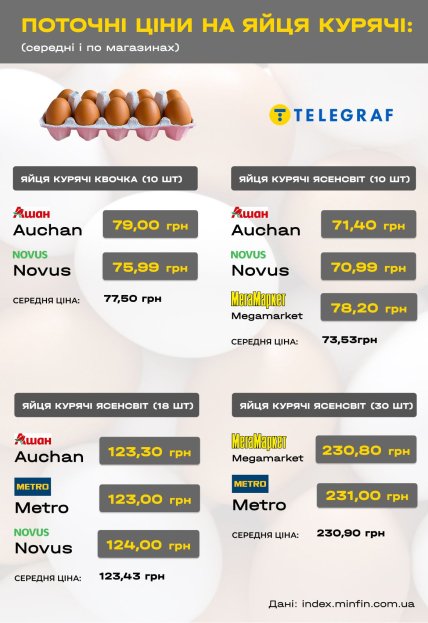 Цифры говорят сами за себя — стоимость яиц с сентября 2024 по сентябрь 2025 года выросла на 50,9%. Если год назад оптовая цена птицефабрик составляла 38-40 гривен за десяток, то сейчас она поднялась до 49-50 гривен. В крупных торговых сетях небрендированные поштучно яйца стоят 5,21 гривны за штуку, то есть уже более 52 гривны за десяток.