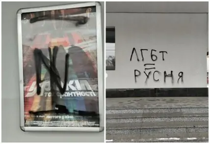 В воскресенье, 11 февраля, на ситилайтах и стенах столичного кинотеатра "Жовтень" неизвестные оставили неприглядные надписи. Вандалы взяли баллоны с черной краской и оставили на здании следующее послание: "ЛГБТ=русня".
