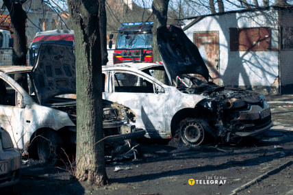 Подъезд дома – сплошное пожарище. Повсюду – изуродованные автомобили и обломки. Жители говорят, что снаряд не детонировал, но пожара не удалось избежать.