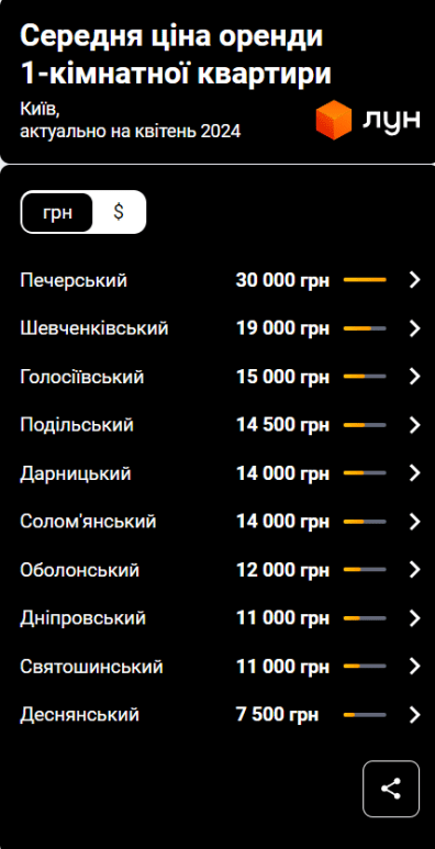 Самые же доступные для аренды однушки можно найти в Днепровском (11 000 гривен), Святошинском (11 000 гривен) и Деснянском (7 500 гривен) районах столицы.