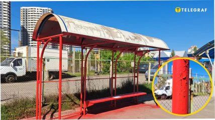 Как результат — краска начала вздуваться, трескаться и опадать, а асфальт вокруг остановок стал кроваво-красным.